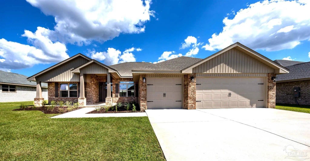 READY NOW! This beautiful Craftsman style 4-bedroom 3 bath all-brick home comes with a 3-car garage and a covered lanai perfect for outdoor gatherings! Upon entering, you'll be greeted by the foyer that leads into the heart of the home. This popular split bedroom design features a living room with French doors. The family room has a door leading to the covered lanai. The kitchen is adorned with stunning quartz countertops with a counter height wrap-around bar, white shaker custom quality cabinets with crown molding, and stainless steel appliances. The primary bedroom is a true sanctuary with a door leading to the covered lanai and an ensuite bathroom. The master bathroom has a garden tub with a separate shower, double vanities with quartz countertops, and two walk-in closets. A 2nd bathroom opens onto the covered lanai with a linen closet, shower/tub combo, and a double vanity with quartz countertops. The 3rd bathroom and a guest bedroom on a separate hallway that is perfect for guests or an older child. Beautiful upgraded LVP flooring is in the main living area for easy care. Embrace the opportunity to make this house your new home! This all-electric home comes with a fully sodded yard, sprinkler system, garage door opener, and many other stunning features. Thank you!