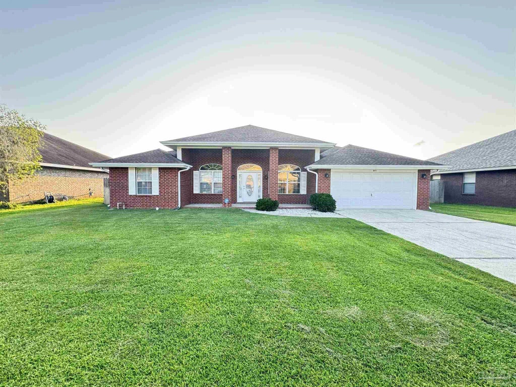 This fully bricked home is situated just off of Blue Angel Pkwy. and Sorrento Rd. in the Southwood Estates. This well-cared for home features easy access to Perdido Key area, new kitchen appliances, two-car garage door, outdoor storage shed, large front and back covered porch area, vinyl flooring, tile kitchen flooring, and a sprinkler system. Primary Suite features a double door to the covered patio, with it's bathroom featuring a separate tub and shower with a double vanity and his and her's closet. The living room features a high ceiling design with several windows overlooking the backyard. Other living areas include dining area and an office or sitting room right as you walk in the front door. The other bedrooms of this home are separate from the primary suite by the central living space and kitchen.
