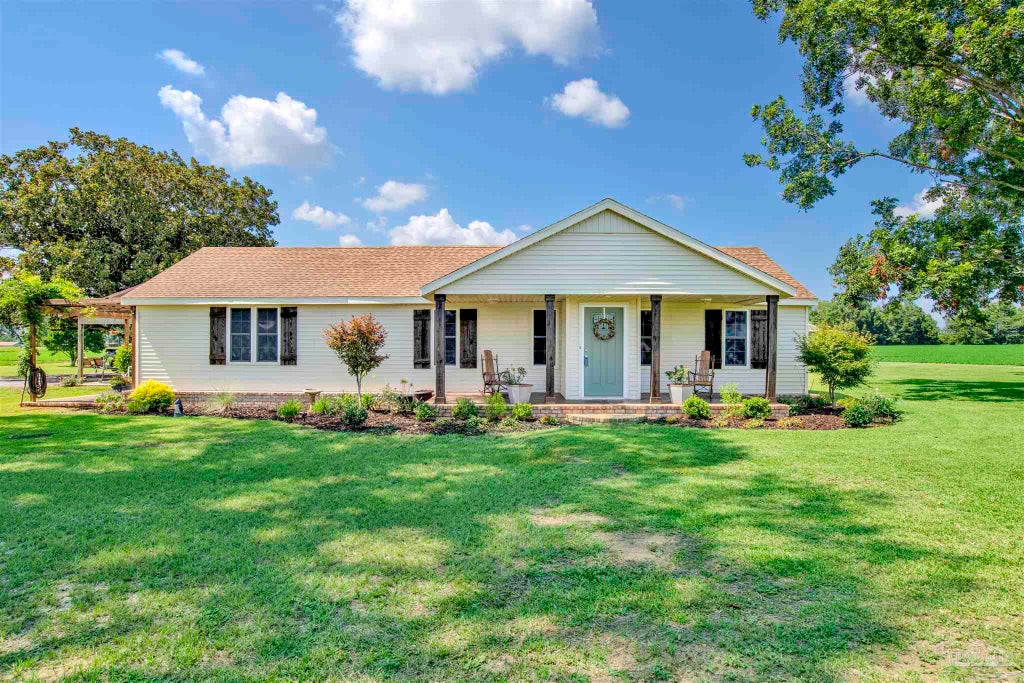 Discover serenity and charm in this meticulously updated 2-bedroom, 1.5-bath home nestled on nearly 1 acre of picturesque land. Step inside to find luxury vinyl plank flooring throughout, complemented by tile in the spacious laundry room. The open living room seamlessly flows into the dining area, perfect for gatherings. The kitchen boasts granite counters, graphite-colored appliances, and a blend of Hickory and painted cabinets, offering both style and functionality. The primary suite is a retreat unto itself, featuring ample space for seating, a home office, or a dressing area, complete with a convenient half bath. The second bedroom is generously sized, adorned with double French doors, a walk-in closet, and access to a patio shaded by a charming pergola. The expansive laundry room includes a wet sink and cabinets for added storage. Outside, enjoy the convenience of a 2-car detached carport with additional guest parking, ensuring plenty of space for visitors. A workshop with power and water adds versatility, ideal for hobbies or projects. Located on a sprawling lot, this home combines modern updates with peaceful surroundings, offering a perfect blend of comfort and functionality for relaxed living.