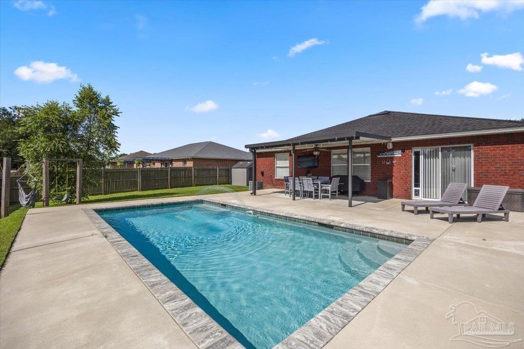 This 3 bedroom // 2 bathroom all brick residence has an IN-GROUND GUNITE SWIMMING POOL and sits in the heart of Pace. Enjoy walking on the sidewalks or taking a quick golf cart ride to the library or to a high school football game! The floor plan is open and split, with an abundance of upgrades! The living room has vaulted ceilings, board and batten, and a built-in shiplap entertainment wall. Kitchen boasts an eat-in kitchen, an island, and a pantry! The formal dining room has newly installed barn doors to separate it from the rest of the home, making it an official “bonus room”. Use it as an office/study, a gym/workout room, a game room, or even a fourth bedroom. Master suite has a garden tub, a separate shower, double vanities, and a walk-in closet. The backyard is one of the largest in the neighborhood! Even with the pool, it has plenty more room for toys and to play! There a privacy fence, a storage building, a swing set, and a spacious concrete patio to entertain and dine outdoors. The porch cover has a fan, adjustable lighting, and Bluetooth speakers. Sentricon stations are in place, as well as an irrigation system. The pool features different colored lighting, a water fountain, an oversized sand filter, and coping pavers. The two-car garage has pull-down stairs to access the attic. Extra insulation has been added. There is updated wood-like flooring throughout the main living areas. Updated carpet, as well as a decorative accent wall, is in each of the two guest bedrooms. Additional interior upgrades include the front door, ceiling fans, light fixtures, plumbing fixtures, mirrors, bathroom vanities, countertops, kitchen appliances, kitchen backsplash, and shelving. All walls and cabinets have been re-painted. Home has only had one owner and has been well-maintained. Refrigerator and security cameras convey with the sale. Mantle and electric fireplace are negotiable. SELLERS WILL INSTALL A NEW ROOF WITH AN ACCEPTABLE OFFER! Average electricity bill is ~ $150.