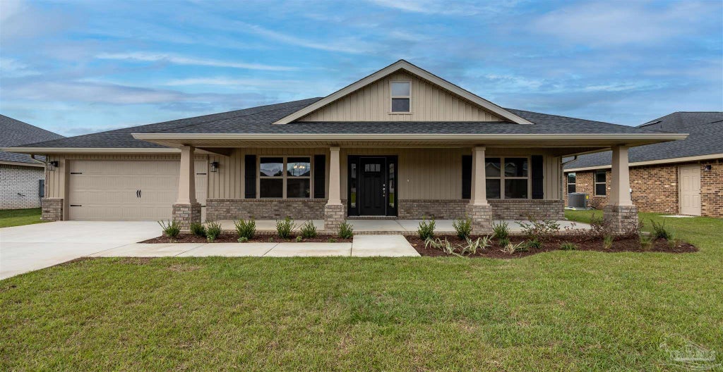 This lovely home is READY NOW! This Craftsman-style home is a spacious and charming 5-bedroom, 3-bathroom home with an inviting front porch providing a welcoming entrance. Upon entering the home, you are greeted with an inviting foyer opening into the spacious living area featuring beautiful upgraded LVP flooring for easy care. The heart of this home is the open-concept living space, where the kitchen seamlessly connects to the family room with a large island. The kitchen has upgraded beautiful granite countertops, custom upgraded shaker antique white cabinets with crown molding, and stainless steel appliances. The owner's suite is a true sanctuary, featuring an ensuite bathroom featuring a corner soaking tub, a separate shower, and granite countertops. The 5 bedrooms offer ample space for family or guests, with possibilities for various uses such as bedrooms, home offices, or hobby rooms. The backyard offers outdoor living space with room for relaxation and entertainment with an upgraded 14' x 16' covered porch. This beautiful home comes with a fully sodded homesite with a sprinkler system, a garage door opener, gutters all around the whole home and covered rear porch, and many other stunning features. Thank you!