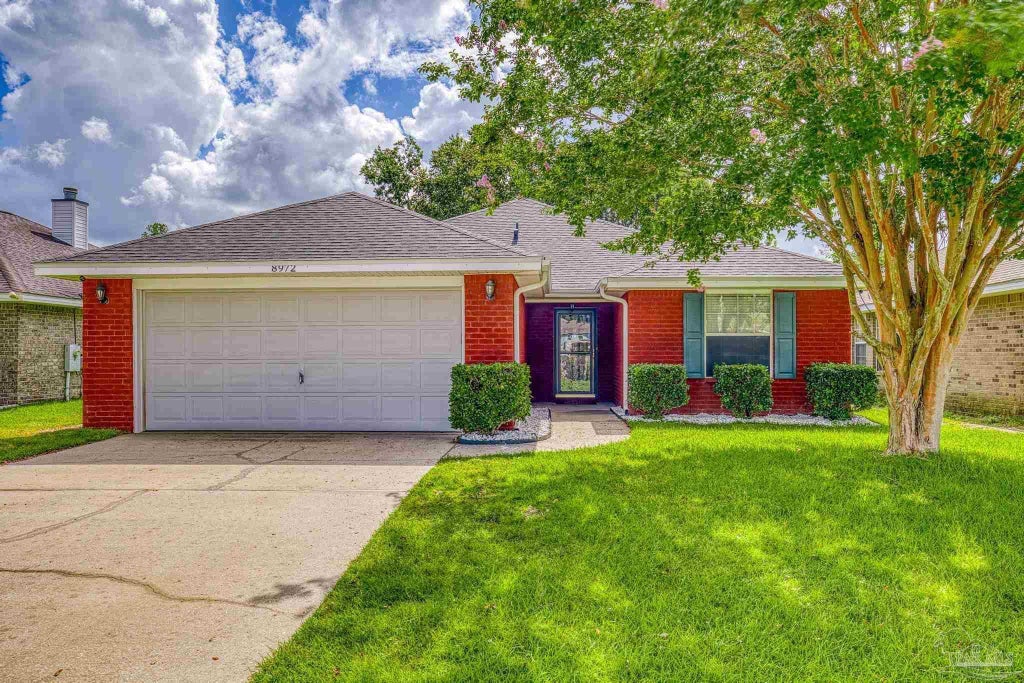 Beautiful all brick home located in desirable Newcastle Place Subdivision with Community Pool, Playground, sidewalks and underground utilities. This three-bedroom two bath all brick home is two houses from the cul-de-sac for low vehicle traffic. The roof was replaced in December 2023, the water heater was replaced July 2024 and the heating and cooling system was replaced in 2019. The dishwasher is new, and all appliances convey including the washer and dryer. The floor plan is a very open, split bedroom plan with high ceilings in the great room and primary suite. Kitchen is spacious and includes an island with outlet, large pantry, raised breakfast bar and view to the great room and backyard. The primary suite includes a sitting area, bath includes two walk in closets, a large linen closet, water closet, double vanity, garden tub and separate shower. Enjoy the 17x17 covered patio overlooking the privacy fenced backyard with firepit. The guest bedrooms are split from the primary suite and include double door closets. The two-car garage includes work benches and shelves which will remain. There is gas to the street and the home has copper plumbing. The home also has the Sentricon system for termite protection and hurricane protection devices. Home is conveniently located near 9 Mile Road, shopping, restaurants with quick access to Interstate 10, the Navy Federal Complex and 15 minutes to downtown. Permits in document section for Roof and HVAC replacement.