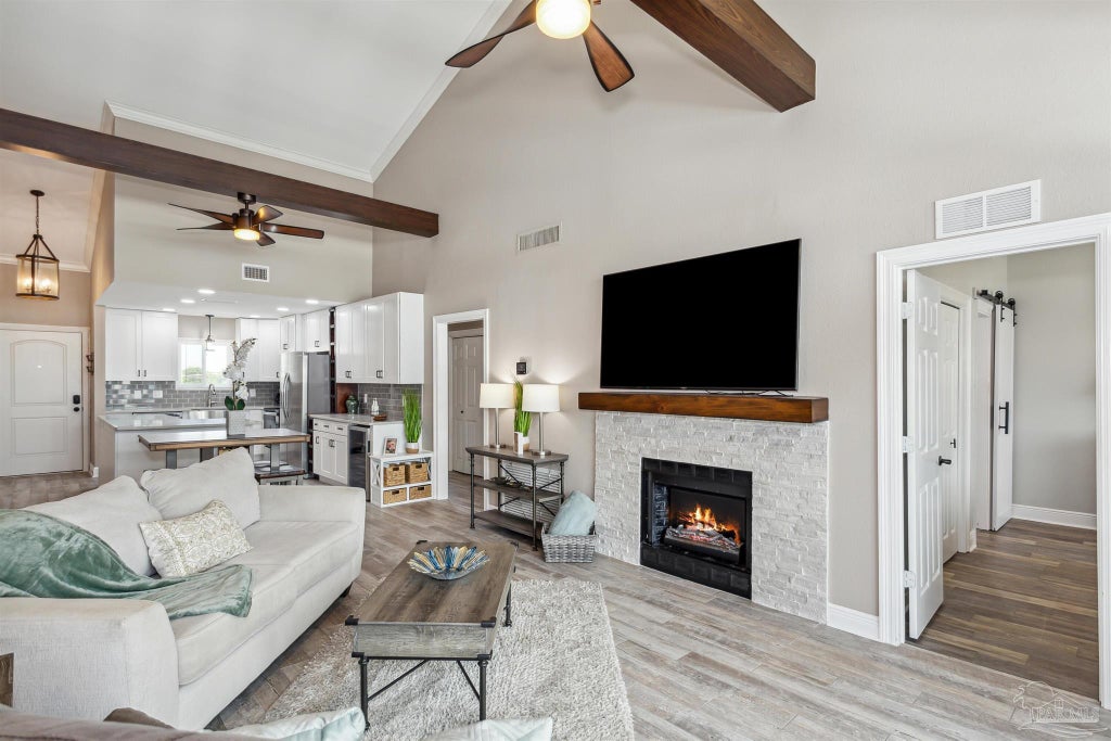 Here’s your chance to own a slice of paradise on the serene waters of Old River, just minutes from the pristine Sugar Sand Beaches of Perdido Key. Enjoy the best of both worlds—whether you’re dipping your toes in the sugar sand, sunbathing, and playing in the Gulf of Mexico, or taking your favorite watercraft out on the calm waters of Old River. This beautifully maintained, furnished, two-bedroom, two-bath condo is ready for a new owner. The main living area features an open floor plan with cathedral ceilings, woodgrain tile, and an electric fireplace, offering ample space to relax or entertain. The newly renovated kitchen is a chef’s dream, with stainless steel appliances (purchased in 2021), a custom backsplash, granite countertops, new cabinetry with a custom wine rack, two lazy Susans, pull-out shelves, and a wine cooler. The spacious master bedroom is perfect for unwinding after a fun-filled day at the beach. It has stunning views of the water and two master closets with custom shelving. Both bathrooms have been updated with new granite countertops, sinks, cabinets, and toilets. The second bathroom features a jetted shower, while the master bath boasts a jetted garden tub. The second bedroom, with its queen-sized bed and luxury vinyl flooring, is ideal for accommodating guests. Step out onto the balcony to enjoy fabulous views of the Bay. Savor your favorite cocktail while watching the vibrant activities on Perdido Bay from sunrise to sunset. Additional updates include new lighting throughout, a new HVAC system (2023), a roof replacement (2021), new impacted-rated windows and doors. Don’t miss this opportunity to embrace the beach life!