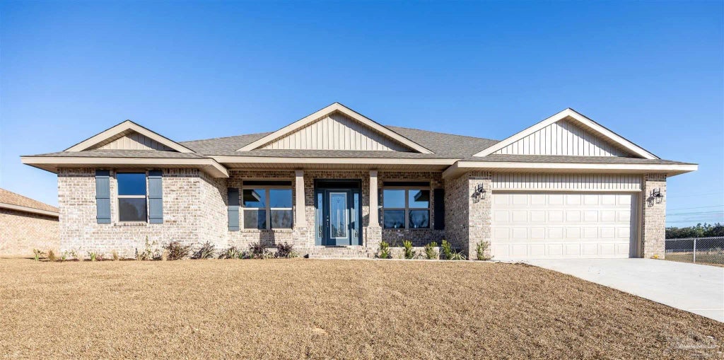Ready Now! Step into your dream home with this charming 4 bedroom 2 bath gem! This beautiful 'All Brick' home boasts an amazing front porch that is sure to steal your heart. As you enter the foyer, you'll be greeted by high ceilings and French doors leading to the Living Room. The spacious layout offers plenty of room for both relaxation and entertainment. The kitchen features custom-quality white shaker cabinets with stunning granite countertops, and Frigidaire stainless steel appliances with ample counter space making meal preparation a breeze. Retreat to the master bedroom, a sanctuary of comfort and serenity. Double doors lead out to the covered lanai to enjoy your morning cup of coffee. The master bathroom comes complete with a double vanity, granite countertops with undermount sinks, a soaking tub, a separate shower, and 2 closets. The remaining three bedrooms are also well-sized. One of the bedrooms has a door leading to the covered lanai that makes a welcoming and warm space for a sunroom or an office. This home has beautiful durable LVP flooring in the main living area. This all-electric home comes with a fully sodded yard, sprinkler system, garage door opener, and so much more. Don't miss the opportunity to make it yours! Thank you!