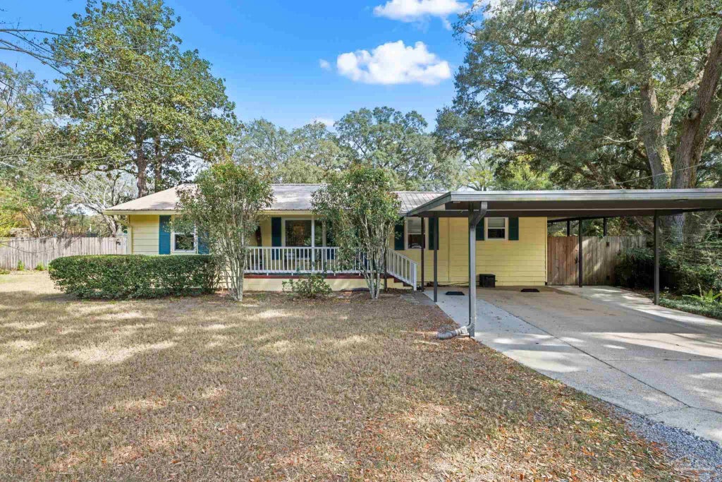 Nestled on an unbelievable lot, this meticulously maintained home has been thoughtfully updated. The spacious living and dining area with beautiful hardwoods are ideal for entertaining. The fully remodeled eat-in kitchen boasts Quartz countertops, a mosaic tile backsplash, and contemporary white shaker-style cabinets with pull-out shelving. The den offers flexible living options—perfect as a TV room, office, or workout area, with charming beadboard paneling and chair railing. The split floor plan ensures privacy, with a generously sized master suite featuring a walk-in closet with custom shelving, an ensuite bath, and access to a covered porch. The master bath is designed for luxury, offering a pocket door, linen closet, double vanity with granite countertops, modern tile with metallic edging, and a custom six-foot tub with a shower and glass enclosure. Two additional spacious bedrooms include large closets and share a beautifully updated second bathroom with a granite countertop and an oversized walk-in shower with a glass enclosure. Beyond its stylish design, this home boasts numerous upgrades, including double gas-sealed windows, a durable metal roof, and an encapsulated crawl space with a dehumidifier. New air conditioning ducts enhance comfort, while a generator connector box, located outside the laundry room and the 20' x 10' workshop, ensures power backup during blackouts. Additional storm-ready features include hurricane shutters, hurricane-impact-resistant windows, and back door, and a portable generator (fully labeled). The property also offers two workshops—one measuring 20' x 10' with an external generator connection and another at 12' x 10'-ideal for storage, studio, or a workshop. Additional features: waterproof click-lock vinyl plank and wood-grained laminate flooring, custom blinds, recessed lighting, crown molding, and baseboards. The backyard is a lush retreat, featuring mature native and tropical plants.