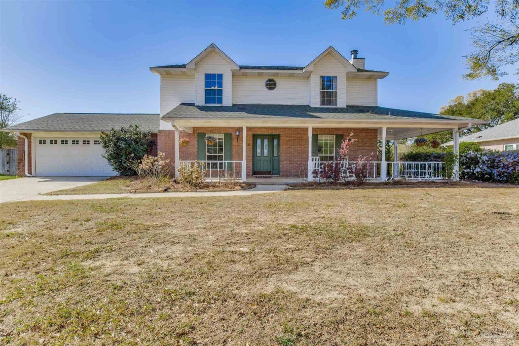 Welcome to this charming custom-built two-story home, nestled in the sought-after Turnberry section of the prestigious Kings Road Neighborhood. Offering the perfect blend of comfort and style, this two story 3-bedroom, 2.5 bath home is designed to make you feel right at home. As you enter, you are greeted by a beautiful foyer with hardwood floors, leading to a formal dining room complete with chair rail details and a ceiling fan. The spacious great room features a cozy brick fireplace with a raised hearth and mantle, two inch blinds and a ceiling fan for added comfort. French doors open to a large wood deck with an above-ground pool and a pool house—ideal for entertaining family and friends. The eat-in kitchen boasting quartz counters, new stainless steel appliances (installed in 2021), a stylish travertine tile floor, a breakfast bar, and a bay window breakfast area, perfect for enjoying your morning coffee. The convenient inside laundry room includes washer and dryer, has travertine tile floor and built-in cabinets. Upstairs, you'll find a split primary suite with a ceiling fan, plush carpeting, and a spacious walk-in closet. The en-suite primary bath features a tiled shower with a glass surround and a vanity with a solid surface top. Two additional bedrooms each offer ceiling fans and wall closets, providing ample space for family or guests. The home is complete with a two-car garage that features pull-down stairs and a pedestrian door for easy access, plus a large wood deck with a built-in bench and plenty of room for a BBQ, ideal for outdoor gatherings. The privacy-fenced yard adds an extra touch of seclusion and relaxation. There is also a sprinkler with irrigation well. Additional updates include a new roof in 2020 and a pool liner and pump that are only four years old. HVAC is 5 years old. New HWH. Come see all that this exceptional home has to offer!