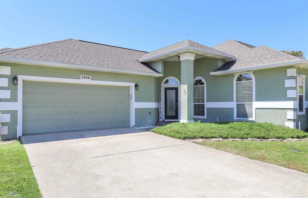 Stunning waterfront stucco home features three bedrooms, two baths, and a dedicated office with a great floorplan. The interior boasts high ceilings with elegant crown molding, tile flooring throughout the main living areas, and plush carpeting in the bedrooms. The kitchen is a chef’s delight, complete with granite countertops, all appliances, two pantries for ample storage, and a cozy breakfast nook. A laundry room with a sink is conveniently located off the two-car garage for easy access. The spacious primary suite includes a tray ceiling, ceiling fan, and a luxurious en-suite bath with dual walk-in closets, a double vanity, a linen closet, and a large walk-in shower. Enjoy breathtaking waterfront and golf course views from the living room, dining area, and kitchen, or relax outdoors in the screened-in patio or on the open deck. This home offers a perfect blend of comfort, style, and scenic beauty—don’t miss this incredible opportunity! New roof in 2021 and HOA maintains the lawns.