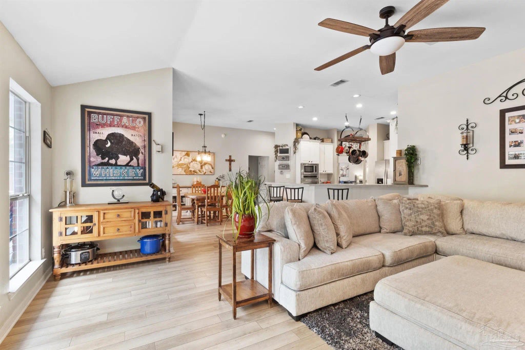 DONT MISS OUT!!!! Seller is Offering $5,000 credit to buyer as "anyway" money! For you will fall in love with this turn key Heron's Forest beauty, adjacent to the Trout Point Nature Area! This is an immaculate 4 bedroom 2 bath brick home with double garage located in the Perdido Key area features vaulted ceilings, split bedroom layout, and an open 2397 sqft floorplan. The 4th bedroom can also be used as an office. A new roof as of 2020, Luxury vinyl flooring throughout, his and her master closet, brand new deck, and a wooded fenced back yard. It is conveniently located near NAS Pensacola and Perdido Key. This residence is surrounded by lush trees that provide ample shade and a sense of natural tranquility. The curb appeal is immediate, with a well-maintained exterior and landscaped front yard inviting you to explore further. This gated neighborhood offers a tennis court with basketball hoops, outdoor pool, low traffic and access to the NAS Trout Point Nature area with its own secluded beach!