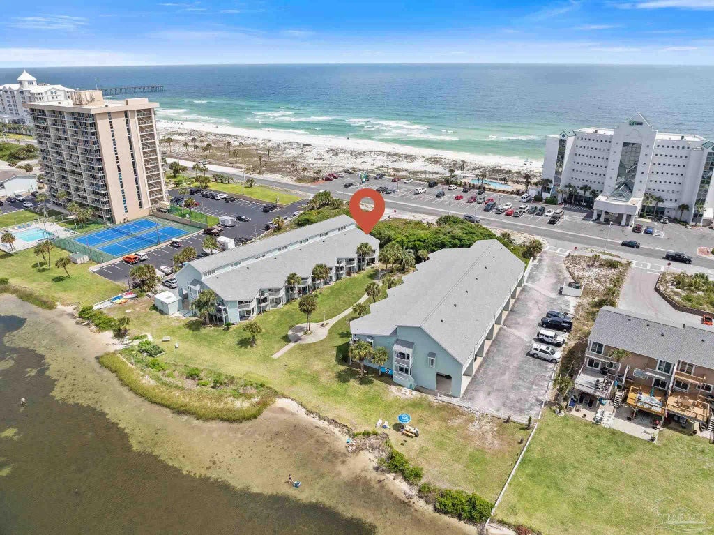 This charming first-floor condo with views of Sabine Bay in the highly desirable Sand Dollar complex is an incredible opportunity to enjoy low-maintenance coastal living. An ideal choice for those seeking a primary residence, second home, or investment, with low HOA dues, short and long-term rental possibilities. Directly across from the Gulf and only a short walk or golf cart ride to shopping, restaurants, and casino, beach, and Quiet Water Boardwalk. Fully furnished, turnkey unit ready for short-term rentals immediately. Enjoy kayaking or paddle boarding on the quiet waters of Little Sabine Bay or take a front row seat during Blue Angels air shows, lighted boat parades, and holiday fireworks. The kitchen’s beautiful light oak shaker style cabinetry and pantry offer a tremendous amount of storage, while the breakfast bar is perfect for dining. Appointed with neutral porcelain tile flooring and a light coastal paint palette, the living, dining, and patio areas are the perfect space to entertain guests or simply relax after a day at the beach. The thoughtfully designed master bedroom, complete with an ensuite full bath and double closets, creates a sense of spaciousness, enhancing the overall feeling of openness and making the room feel even larger. A stackable washer/dryer is conveniently tucked away just outside the bedroom, maximizing the interior floor plan. Complex renovations in 2020 included roof and sliding door replacement, and exterior paint. Homeowner Association fees include community maintenance/grounds keeping, water, sewer, trash removal, and insurance. No pets are allowed.