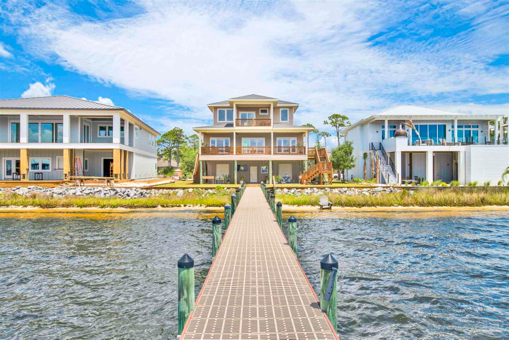 WATERFRONT PARADISE DIRECTLY ON THE INTRACOASTAL WATERWAY WITH PANORAMIC VIEWS AND PRIVATE BOAT DOCK! Prepare to be captivated by this stunning waterfront residence nestled in the desirable, gated community of Russell Bayou on Innerarity Island. Offering breathtaking views of the Intercoastal Waterway, Ono Island, and Perdido Key, this home is an entertainer's dream and a boater's delight! Step inside and be greeted by an expansive and open-concept living area. The kitchen boasts a large island complemented by sleek stainless steel appliances and plenty of cabinetry. The living room features a lovely triple sliding glass door that opens to an enormous deck, your private oasis for enjoying the water views. Also located on this main level are two generously sized bedrooms with en-suite bathrooms. Ascend to the third floor, dedicated entirely to the primary suite. This private sanctuary includes a laundry room, dual walk-in closets with custom built-in organization, and private balcony where you can savor your morning coffee or evening sunsets. The primary bath features separate sinks and vanities, a relaxing jetted tub, and an oversized tiled shower. The ground floor offers incredible functionality with a closed-in garage space providing ample parking and storage, and feature four garage doors for easy access from the front and rear of the home so you can conveniently bring your boating or fishing gear from the garage to the dock. An interior entrance leads directly into the main living area, offering convenience and security. Additional features include an energy efficient mini-split HVAC system, irrigation system with well, and thoughtfully pre-built design space to incorporate an elevator reaching all three levels of the home. Residents of Russell Bayou enjoy access to a community pool and tennis courts as well as the added security of being a gated community within the gated community of Innerarity Island. This is more than just a home; it's a lifestyle!