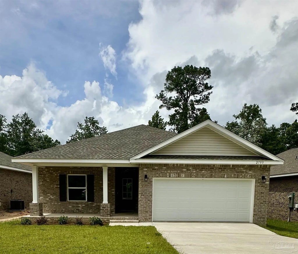 4 SIDES BRICK, 9 FT CEILINGS, 3 CM QUARTZ COUNTERS, DOVE TAIL, BIRCHWOOD CABINETS W/ SOFT CLOSE, COVERED FRONT AND BACK PORCH, PRIVATE BACK YARD, backed up to conservation land. NEW COMPLETED CONSTRUCTION in the prestigious Bentley Oaks Neighborhood, with community park featuring playground, pickle ball and basketball. 3/2/2 1690 sq ft home in Bentley Oaks. Conveniently located minutes from I-10, easy commute to bases, downtown and to the beach. The Cypress plan has 3 bedrooms, and 2 baths. The design has an open kitchen with large prep island and the popular Shaker Style cabinets featured in the color putty with stained peat islannd. Quartz tops and stainless appliances are featured in kitchen. A built-in microwave is included. The breakfast room has easy access to very nice, covered patio for entertaining, a wonderful pantry and LED lighting makes meal prep a dream. The master suite has trey ceilings and ceiling fan. Deluxe master bathroom has a spacious shower, tops, framed mirrors over the sinks, LED ceiling lights, and large walk-in closet. Durable Luxury, beveled luxury Vinyl Plank floors are in all areas except carpet is in bedrooms and bedroom closets. Quality construction flourishes throughout this home. Double garage, 30 year architectural shingles, energy efficient double pane vinyl windows, storm shutter window protection, and covered by StrucSure, a 10year limited warranty. Call today to view this gorgeous home. Complete and move in ready, photos are of actual home.