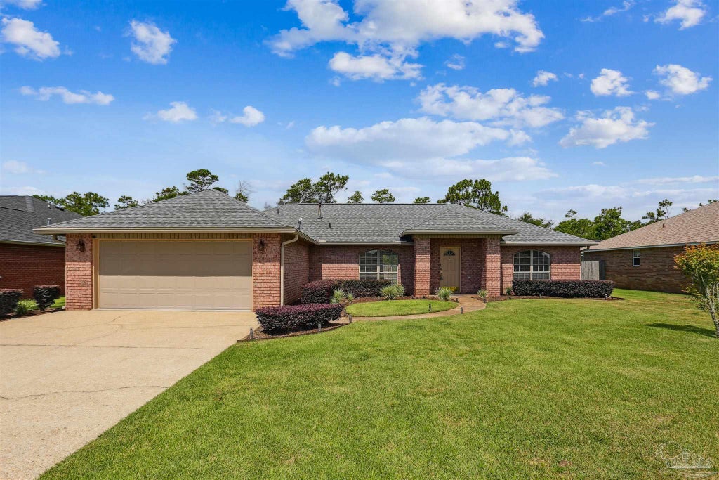 Very nice all brick home with lots of features and upgrades: Split bedroom plan with very large primary suite. Walk in tub was added in 2022 along with a tankless hot water heater in 2023. Spacious walk-in closet in main bathroom. Great room has cathedral ceiling, plant ledge, gas log fireplace. Kitchen is big with all updated appliances, large corner pantry, granite countertops and backsplash, breakfast bar and breakfast room that opens to the Great Room. Very pretty wood floors in all rooms but bedrooms. Seller will consider an allowance for new carpeting. HVAC 2018 and Roof 2020. Interior walls freshly painted. HVAC serviced and air ducts professionally cleaned. Security system. Backyard fence replaced in 2020. Sprinkler system on well. Large open patio overlooking big backyard that has plenty of room for a pool and backs up to wooded area for additional privacy. Superb location ... close proximity to the back gate of NAS Pensacola, Big Lagoon State Park, Perdido Key and Johnson Beach's beautiful sugar white sand , boat launches and boat storage facilities, etc.! Only a 15 minute drive to downtown Pensacola!