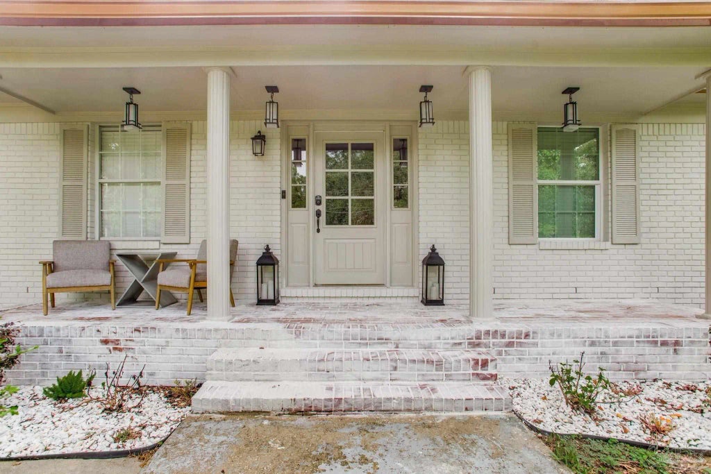 Step into effortless style and everyday comfort in this beautifully renovated ranch, perfectly nestled on a spacious, tree-shaded lot in the heart of Pensacola. This single-level stunner marries classic curb appeal with designer finishes throughout — every inch thoughtfully updated. A welcoming front porch sets the tone with whitewashed brick, statement lighting, and charming columns. Inside, you're greeted by a magazine-worthy foyer with paneled green accent walls, herringbone brick floors, and curated art niches that make a memorable first impression. The open-concept living space is a showstopper — anchored by a sleek, tiled fireplace wall and flooded with natural light. The kitchen blends sophistication and function with a dramatic oversized island featuring handcrafted green tile, a farmhouse sink, custom countertops, cabinetry, and brass finishes that elevate the entire space. Even a dog feeding station, is tucked in! With flexible living options, the home includes a bonus room ideal for a home office, library, or playroom. The two bathrooms are true retreats: one features a deep soaking tub with wood-look tile surround and a luxe marble vanity; the primary en suite boasts an oversized glass shower with a rainfall head, floating shelves, dual sinks, and gold fixtures. The large primary bedroom feels like a boutique hotel suite, with serene views of the private backyard and room to spare for a sitting area or peloton nook. Out back, enjoy a brand-new concrete patio with dining space, perfect for summer BBQs, cornhole, or quiet mornings with coffee under the trees. The fully fenced yard is ideal for pets, gardening, or simply relaxing in your own quiet corner of Pensacola. Schedule your private showing today at this incredible price it will be snatched up quickly.