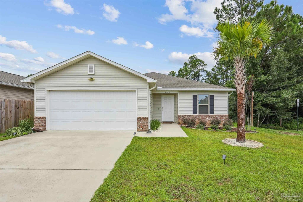 Brimming with charm and efficiency, this beautifully maintained single-story home features fully paid-off solar panels with a 22-year transferrable warranty, keeping the monthly power bill under $30. From the moment you arrive, the exceptional curb appeal is impossible to miss. Well-maintained siding pairs seamlessly with classic brick accents and freshly installed gutters, complemented by well-manicured, picturesque landscaping and a beautiful palm tree that invites you to step inside. Inside, the home is better condition than when first purchased including window treatments and new ceiling fans with remote control function. The expansive living area offers ample room for both entertaining and formal dining, creating a comfortable setting for gatherings or quiet evenings at home. Ceiling fans add year-round comfort, while large windows and sliding glass doors invite in plenty of natural light. The kitchen is just as functional, boasting crisp white cabinetry, gleaming stainless steel appliances, and expansive countertops with an efficient layout that makes cooking a pleasure. Four well-proportioned bedrooms provide comfort, natural light, and generous closet space with soft carpeting and contemporary ceiling fans. The primary suite serves as a private retreat with its own full bath and a generous walk-in closet for convenience and style. Step outside to a new deck topped with an aesthetically pleasing sun shade, creating a comfortable outdoor living space for dining, summer barbecues, or simply unwinding in the fresh air. The fully fenced yard delivers both privacy and space for pets or play. A spacious two-car garage ensures ample parking for residents and guests, along with generous storage options. Located 8 miles from Perdido Key, 5 miles to downtown Pensacola, and 16 miles to Pensacola Beach, this home offers prime convenience and rare privacy with only one neighbor. Whether searching for a first home, downsizing, or investing, this property welcomes you home.