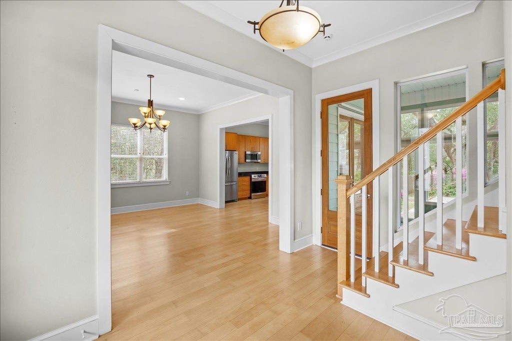 Just minutes from Pensacola NAS! Nestled in the exclusive, double-gated community of Innerarity Island, this stunning home offers privacy, elegance, and natural beauty. Located on a quiet cul-de-sac on a highly elevated lot, it boasts breathtaking surroundings and modern amenities. Nature lovers will appreciate the island’s abundant wildlife, including deer, foxes, and waterfowl. Just a short walk away, the waterways are perfect for fishing, with redfish, speckled trout, and flounder. The community pool and pool house sit along the bayou, offering a serene spot for relaxing afternoons or watching the Blue Angels soar overhead. Tennis courts provide scenic recreation. The fenced backyard is a private oasis, featuring a spacious deck, mature trees, and blueberry bushes. A four-zone sprinkler system, powered by a private well, keeps the yard lush year-round. The home features an open floor plan with elegant crown molding and rich hardwood flooring. The kitchen is a chef’s delight, offering granite countertops, a large island, and modern appliances. Heated and cooled sunroom provides year-round comfort. Upstairs, a bonus room offers flexible space for a family room, media lounge, or home office. The primary suite features a large walk-in closet and a spa-like bath with a double vanity, jetted tub, and stand-alone shower. Three additional bedrooms include a second primary suite with its own private bath, double sinks, and a walk-in shower. The upstairs laundry room adds convenience, while the walk-in attic offers easy-access storage. The two-car garage includes a large storage/workroom and extra storage under the stairs. Recent upgrades include a new roof (2021), two zoned HVAC units (2021), a hurricane-rated garage door (2023), and Low-E windows in the upstairs bedrooms (2023), new garbage disposal 2025. The home also features hurricane panels, a generator hook-up, and a separate 50-amp circuit.