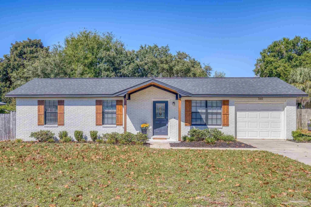 Welcome home! Fabulous location in sought after Tiger Point / Gulf Breeze and within a great community. You have to see this one quickly! Shopping and parks nearby. Completely remodeled. White painted brick with shutters. This 3 bedroom 2 bath house has character. The great room is adjacent to the kitchen. They are separated by a large granite island with cabinetry and drawers on one side and dining seating on the other. Kitchen has all new appliances and new subway tile backsplash. Master bedroom has an ensuite bath. Another bath on the hall serves the spare bedrooms. Vinyl plank flooring throughout. Ceiling fans in great room and all bedrooms. New roof in 2022. Single car garage. Large fenced back yard with patio. Standalone shed in back yard. This fully refurbished home is waiting for you. Come see this gem.